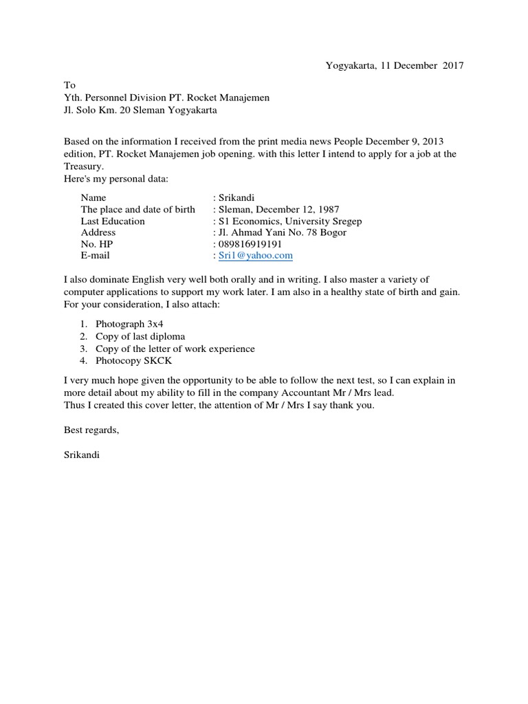 15 Contoh Surat Lamaran Kerja Bahasa Inggris Lengkap Artinya from www.99.co Tak hanya itu, sudah banyak perusahaan atau instansi yang menjadikan lamaran kerja dalam bahasa inggris sebagai salah satu syarat rekrutmen. Isinya pernyataan melamar kerja, pencapaian, … Cover letter bisa disebut juga sebagai surat pengantar saat hendak melamar sebuah pekerjaan. Oct 21, 2021 · contoh cover letter dalam bahasa inggris beserta arti lengkap oleh yona may diposting pada 21/10/2021. Apakah sama dengan curriculum vitae? Memiliki kemampuan berbahasa inggris yang baik secara pasif dan terlebih aktif akan menambah nilai jual seseorang dalam dunia kerja. Aug 11, 2021 · di dalam contoh cover letter bahasa inggris ini, pelamar memberikan bullet point mengenai lampiran dokumen yang disertakan. Oct 05, 2017 · oct 05, 2017 · 7 contoh cover letter bahasa inggeris dapat pujian ceo | siapa tidak kenal dengan nama yang tidak asing lagi ir meor shamshir yang selalu berkongsi pendapat atau cerita tentang anak muda di dalam dunia pekerjaan.